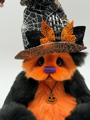 Custom stiffened witch hat with spider trims, necklace with pumpkin